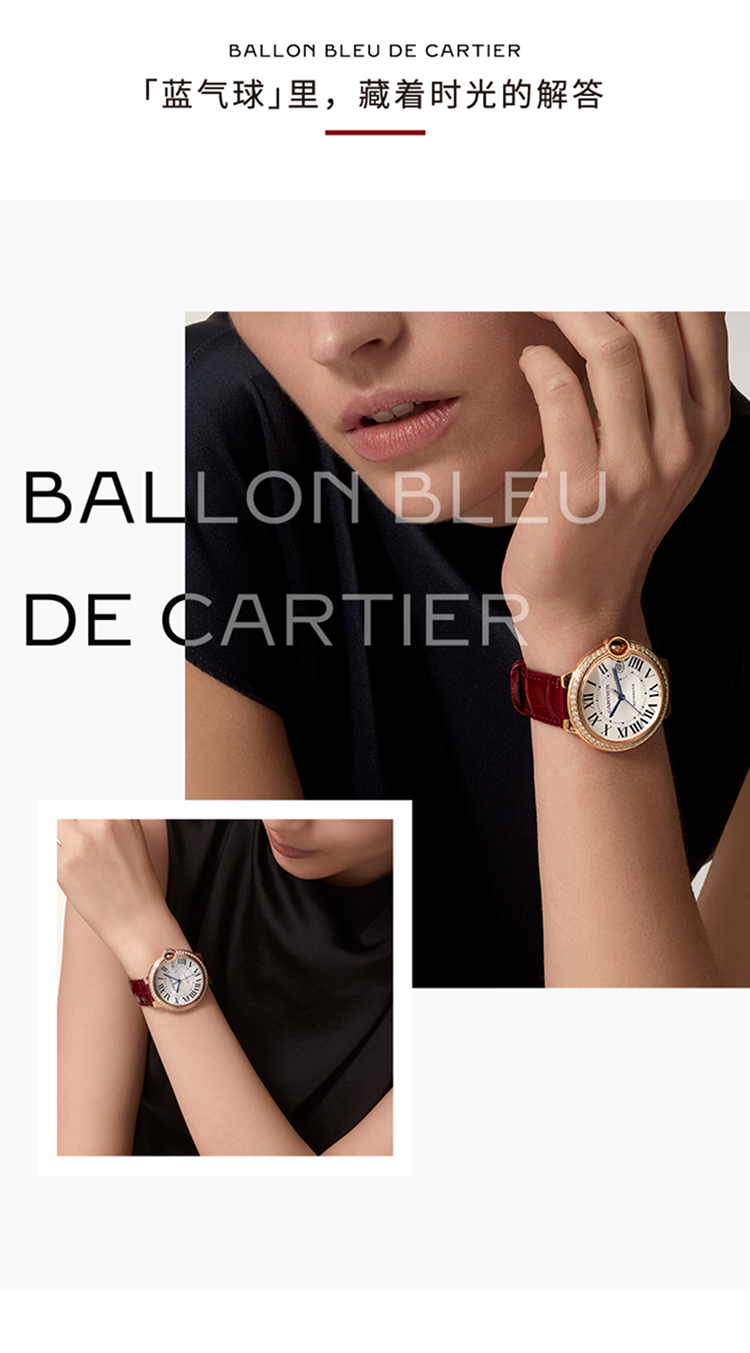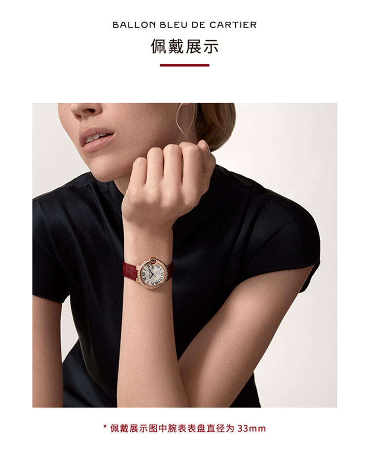 Ballon Bleu de Cartier卡地亚蓝气球腕表,33毫米表款,自动上链机械机芯。750/1000玫瑰金表壳,镶嵌47颗明亮式切割圆钻,总重0.68克拉。凹槽式表冠,镶嵌1颗凸圆形蓝宝石。银色阳光射线纹饰表盘。剑形蓝钢指针。合成蓝宝石水晶镜面。酒红色鳄鱼皮表带,750/1000玫瑰金针扣式表扣。表壳厚度:10.49毫米。生活防水深度3巴(约30米)。