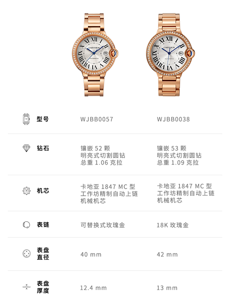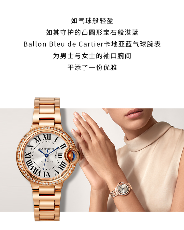 Ballon Bleu de Cartier卡地亚蓝气球腕表,33毫米表款,自动上链机械机芯。750‰玫瑰金表壳,镶嵌47颗明亮式切割圆钻,总重0.68克拉。凹槽式表冠,镶嵌一颗凸圆形蓝宝石。镀银表盘,阳光射线纹饰效果。剑形蓝钢指针。蓝宝石水晶镜面。可替换式750‰玫瑰金表链。厚度:10.16毫米。防水深度3巴(约30米)。
