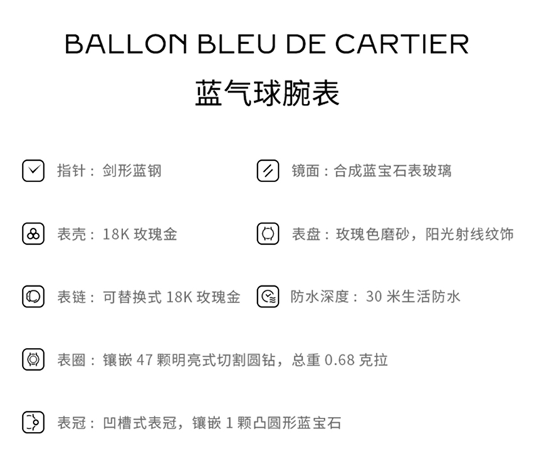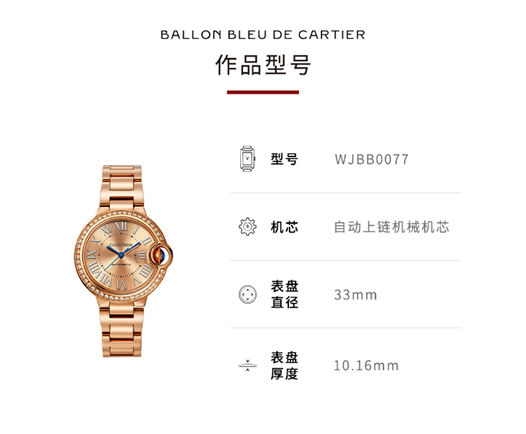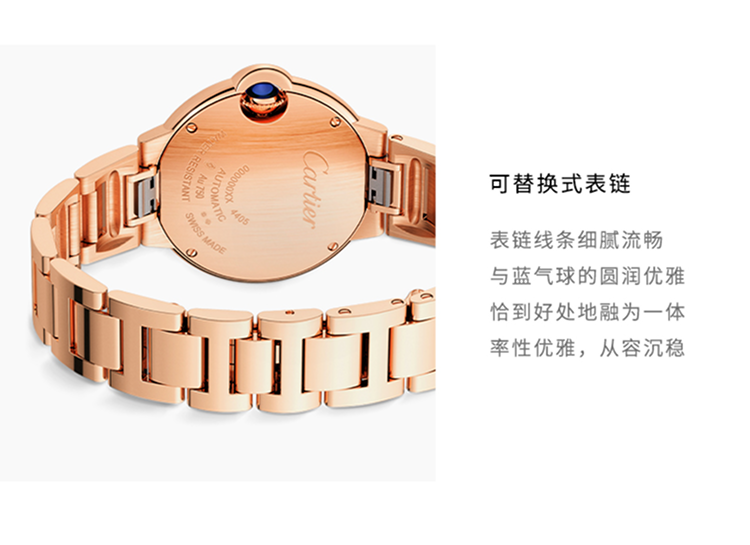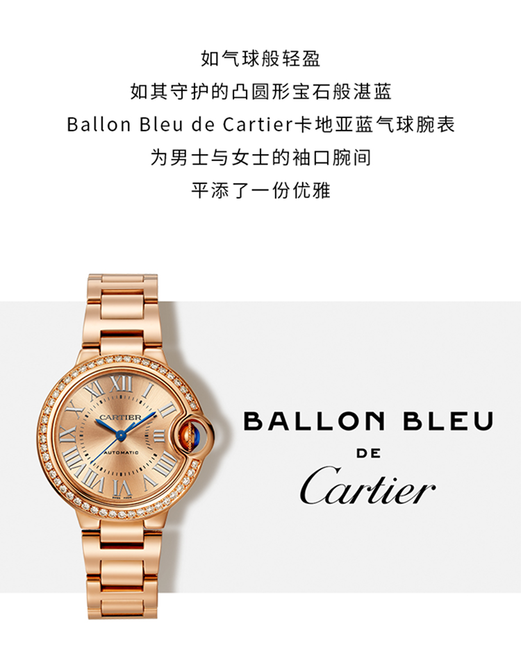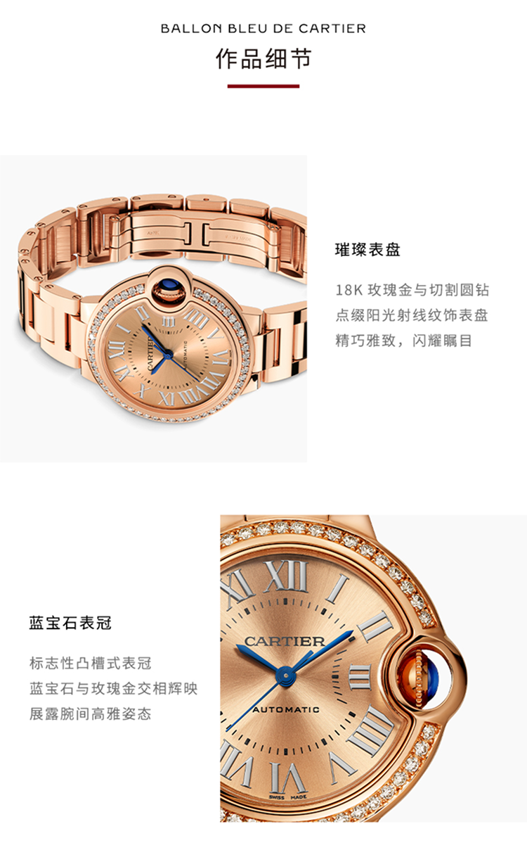 Ballon Bleu de Cartier腕表,33毫米表款,自动上链机械机芯。750‰玫瑰金表壳,镶嵌47颗明亮式切割圆钻,总重0.68克拉,凹槽式表冠,镶嵌一颗凸圆形蓝宝石,玫瑰色磨砂表盘,阳光射线纹饰效果,剑形蓝钢指针,合成蓝宝石表玻璃,可替换式750‰玫瑰金表链。表壳厚度:10.16毫米。生活防水深度3巴(约30米)。