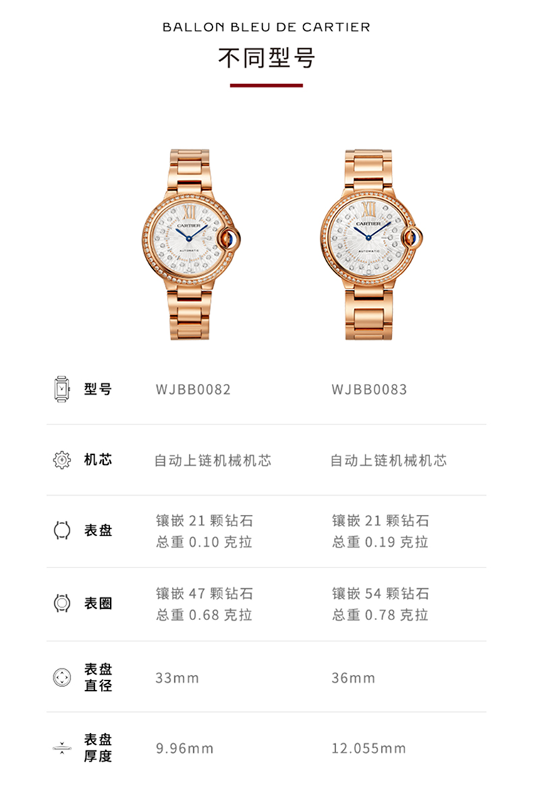 Ballon Bleu de Cartier卡地亚蓝气球腕表,33毫米表款,自动上链机械机芯。750/1000玫瑰金表壳,镶嵌47颗明亮式切割圆钻,总重0.68克拉。凹槽式表冠,镶嵌1颗凸圆形蓝宝石。哑光镀银转印阳光射线纹饰表盘,镶嵌21颗明亮式切割圆钻,总重0.10克拉。剑形蓝钢指针。合成蓝宝石水晶镜面。750/1000玫瑰金可替换式表链。厚度:10.49毫米。生活防水深度3巴(约30米)。