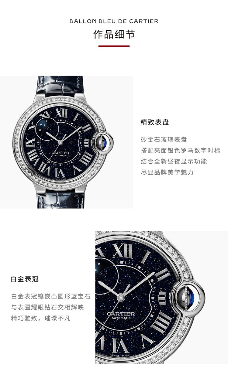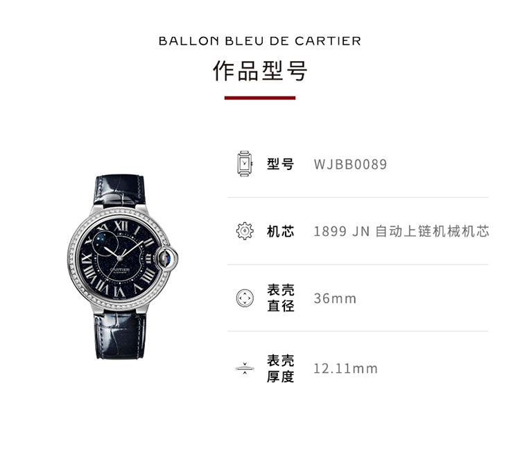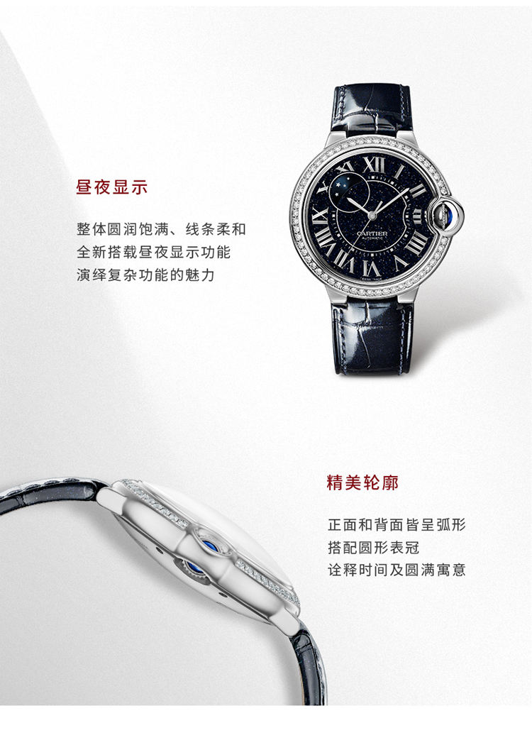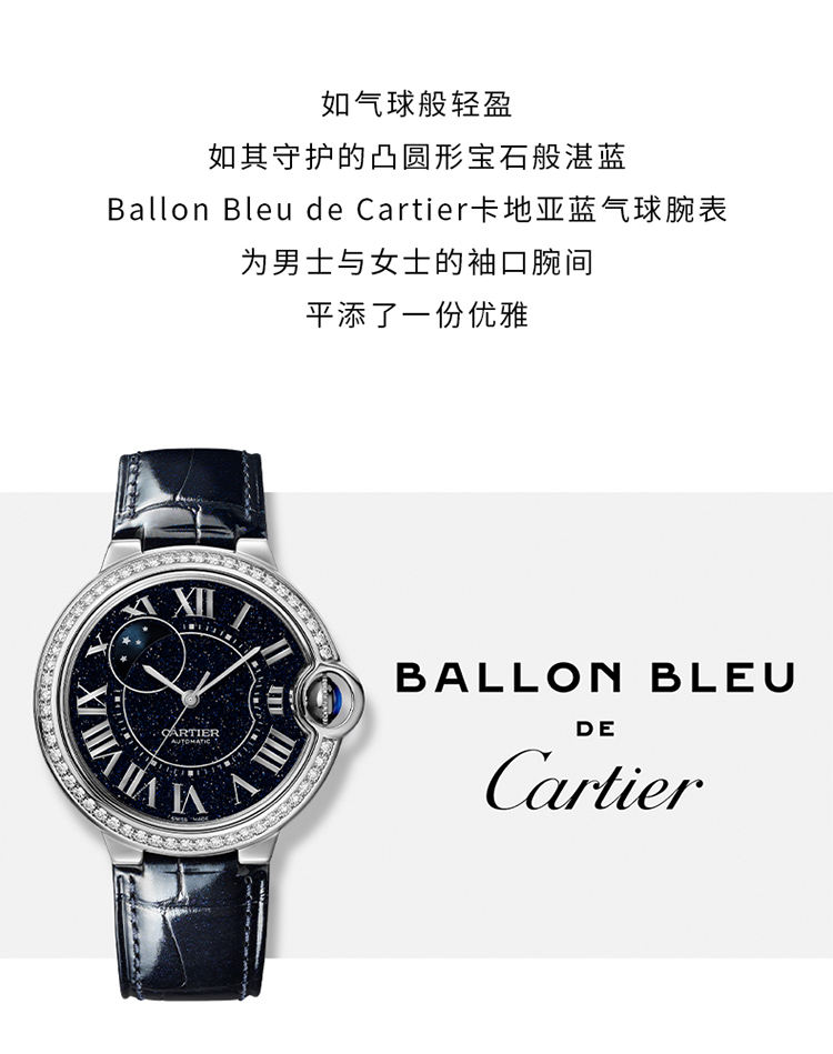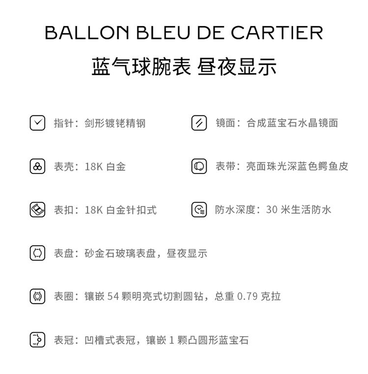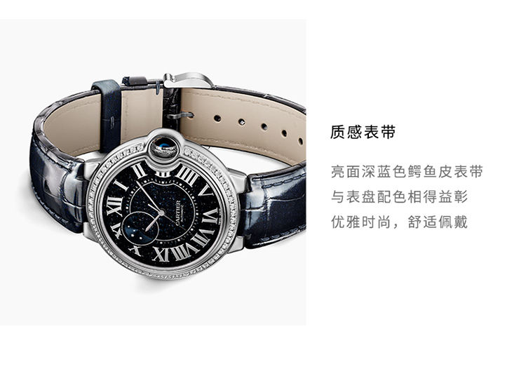 Ballon Bleu de Cartier卡地亚蓝气球腕表,36毫米表款,自动上链机械机芯,昼夜显示。750/1000白金表壳,镶嵌54颗明亮式切割圆钻,总重0.79克拉。凹槽式表冠,镶嵌1颗凸圆形蓝宝石。砂金石玻璃表盘,昼夜显示盘,剑形镀铑精钢指针。合成蓝宝石水晶镜面。蓝色闪亮漆面鳄鱼皮表带,750/1000白金针扣式表扣。表壳厚度:12.11毫米。生活防水深度3巴(约30米)。