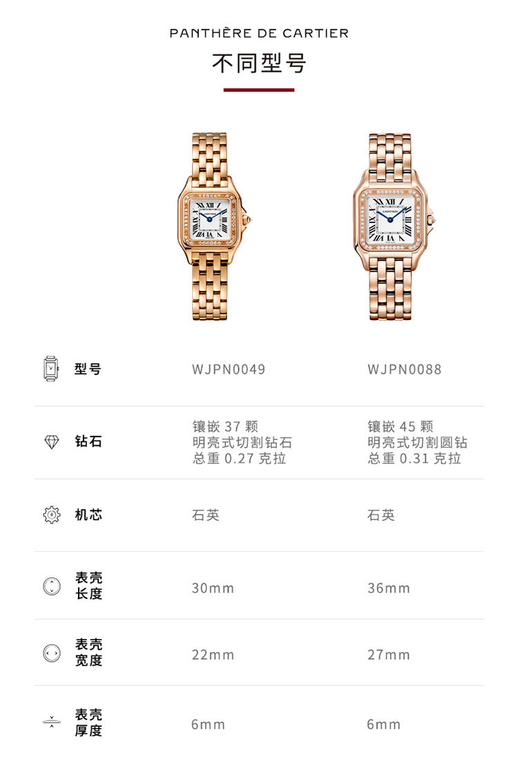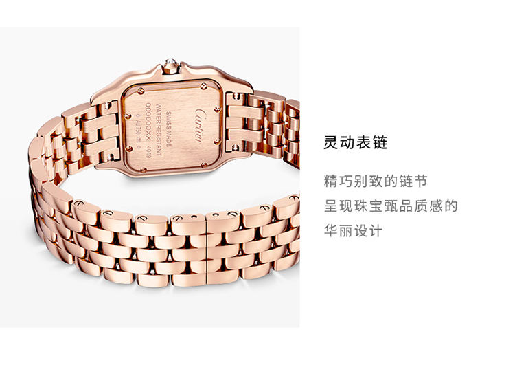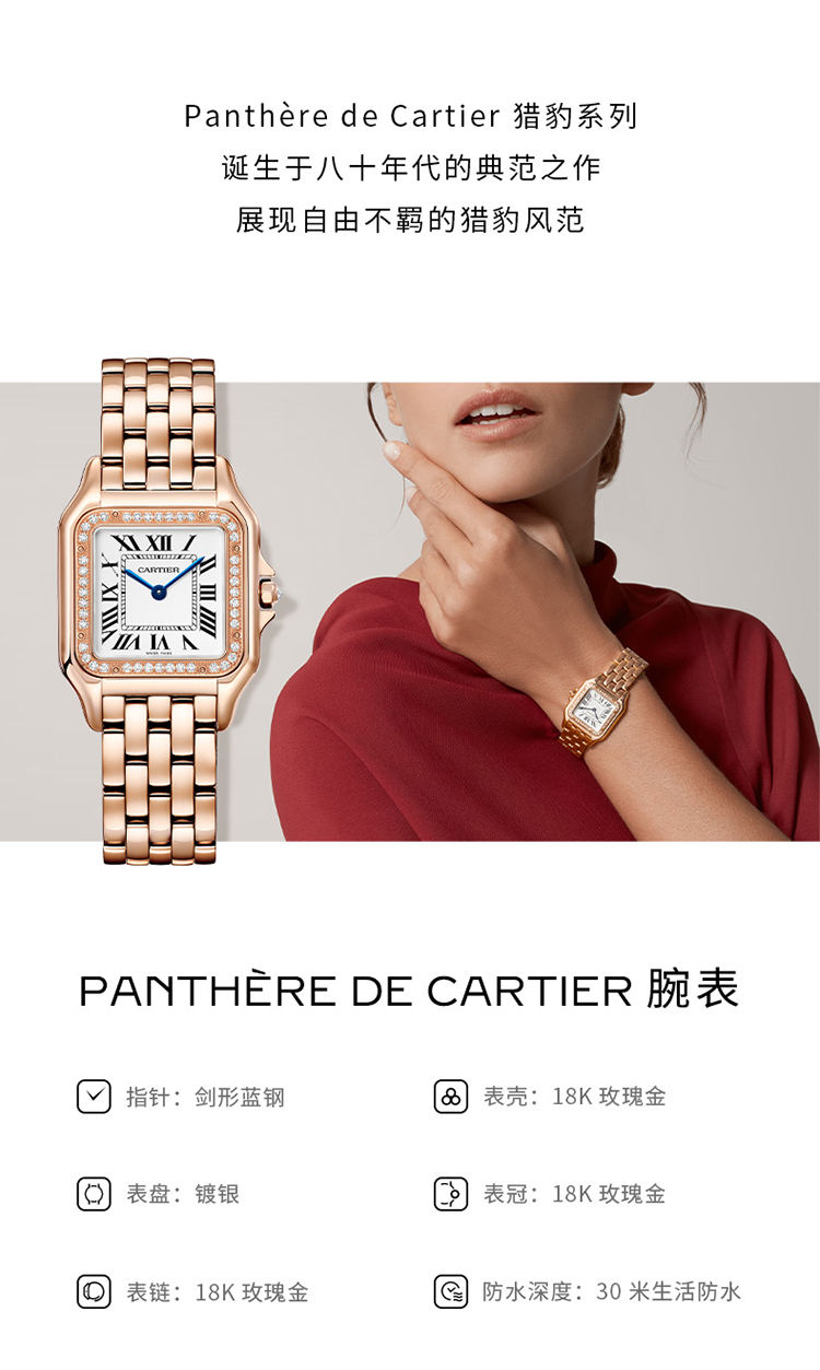 Panthère de Cartier卡地亚猎豹腕表,小号表款,石英机芯。750/1000玫瑰金表壳和表冠,镶嵌37颗明亮式切割圆钻,总重0.27克拉。尺寸:22毫米 x 30毫米。厚度:6毫米。银色表盘,剑形蓝钢指针,750/1000玫瑰金表链。生活防水深度3巴(约30米)。