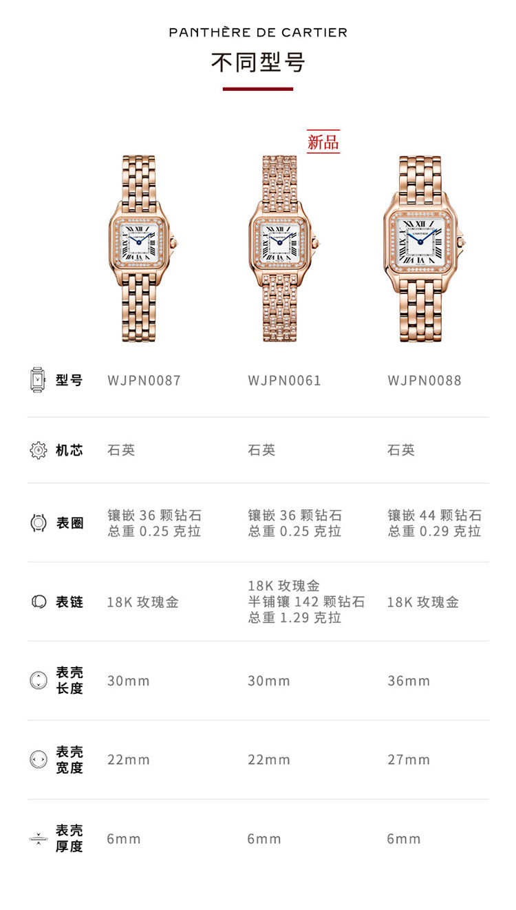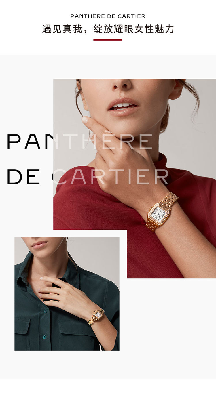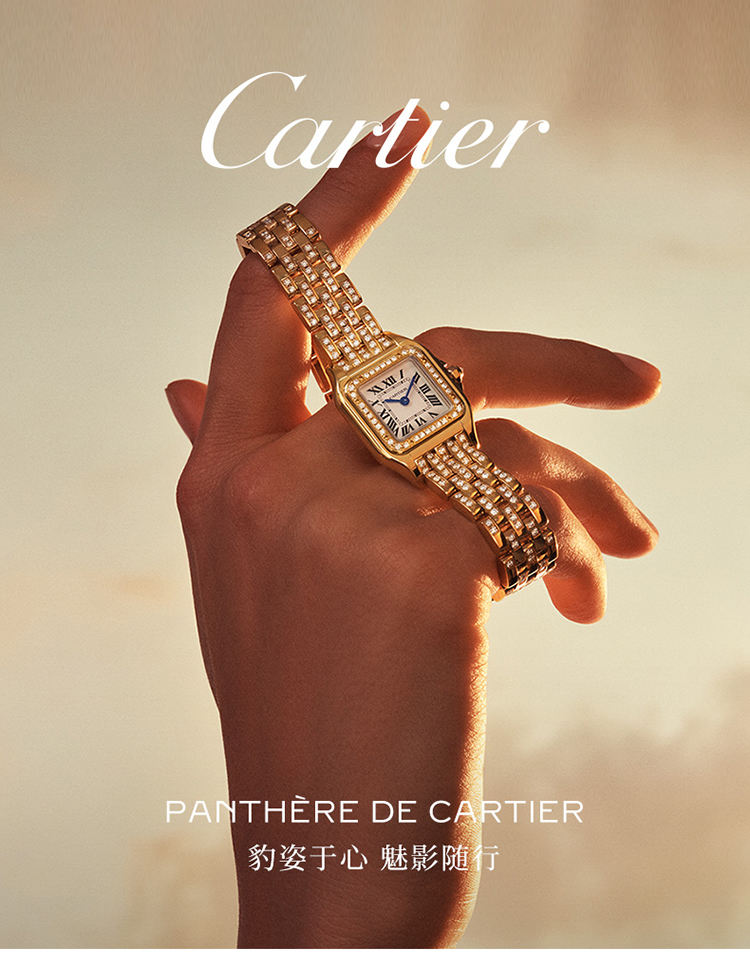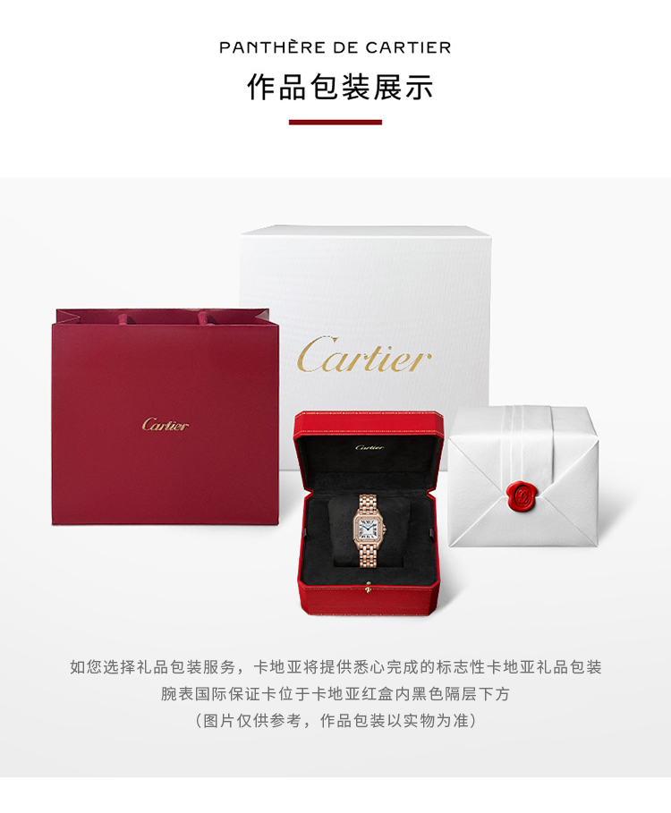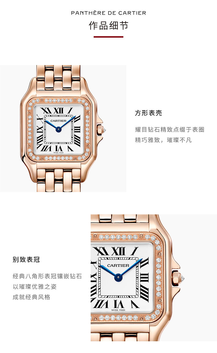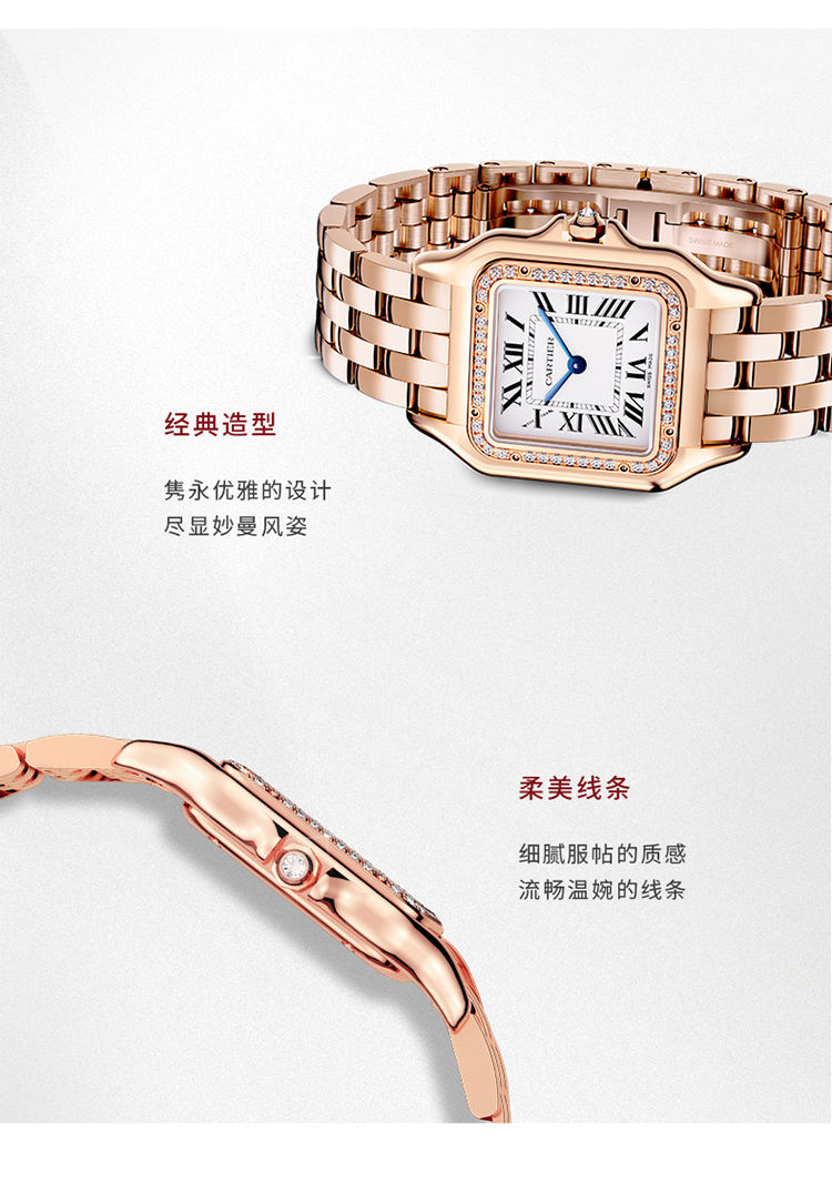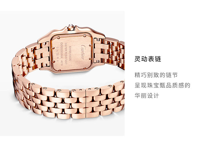 Panthère de Cartier腕表,中号表款,石英机芯。750‰玫瑰金表壳和表冠,镶嵌45颗圆形明亮式切割钻石,总重0.31克拉。尺寸:27 x 36毫米,厚度:6毫米,镀银表盘,剑形蓝钢指针,750‰玫瑰金表链,防水深度3巴(约30米)。