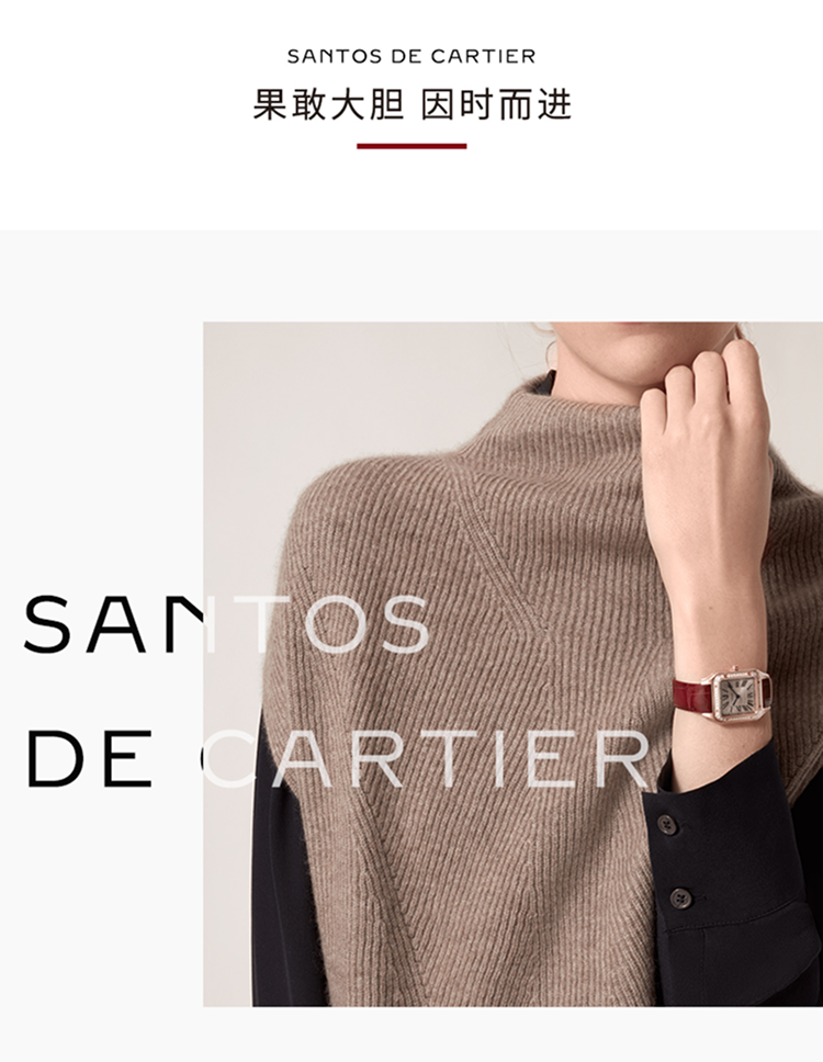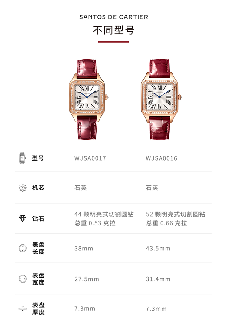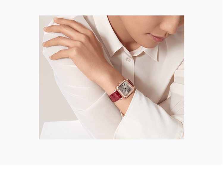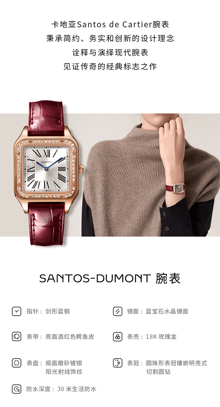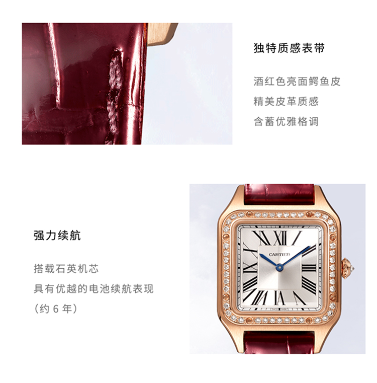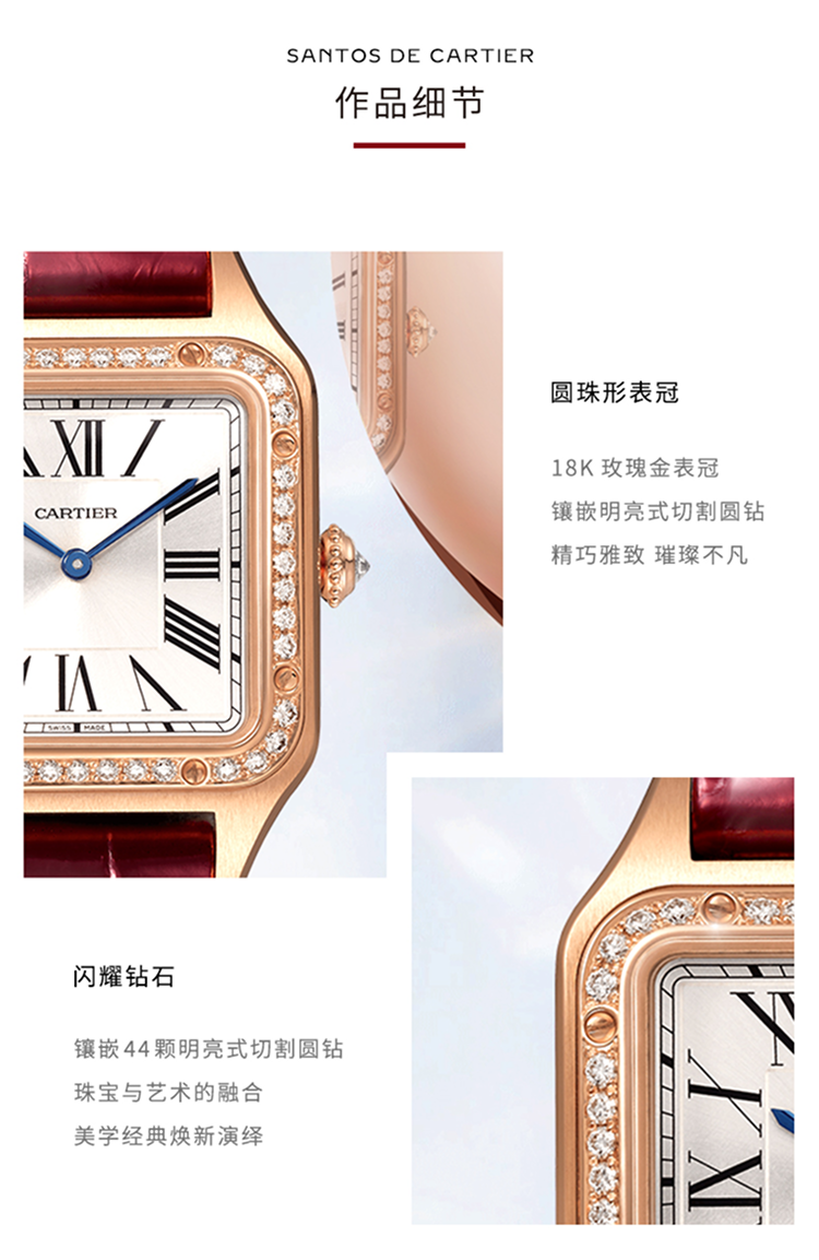 Santos-Dumont腕表,小号表款,高效率石英机芯(续航时间长达约6年)。750‰玫瑰金表壳,表圈镶嵌44颗明亮式切割圆钻,圆珠形表冠镶嵌一颗明亮式切割圆钻,总重0.53克拉,缎面磨砂镀银阳光射线纹饰表盘,罗马数字时标,剑形蓝钢指针,蓝宝石水晶镜面。酒红色亮面鳄鱼皮表带,750‰玫瑰金针扣式表扣。表壳尺寸:38毫米 x 27.5毫米。厚度:7.3毫米。防水深度3巴(约30米)。