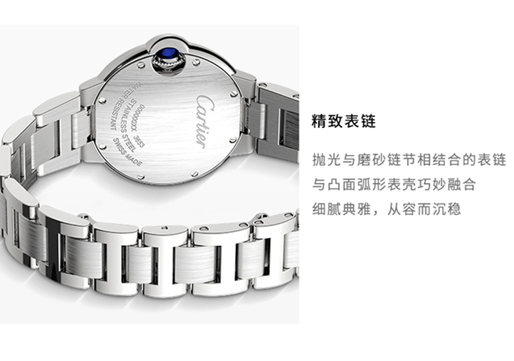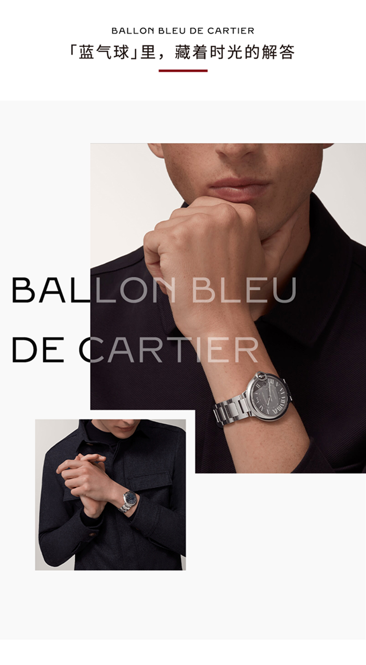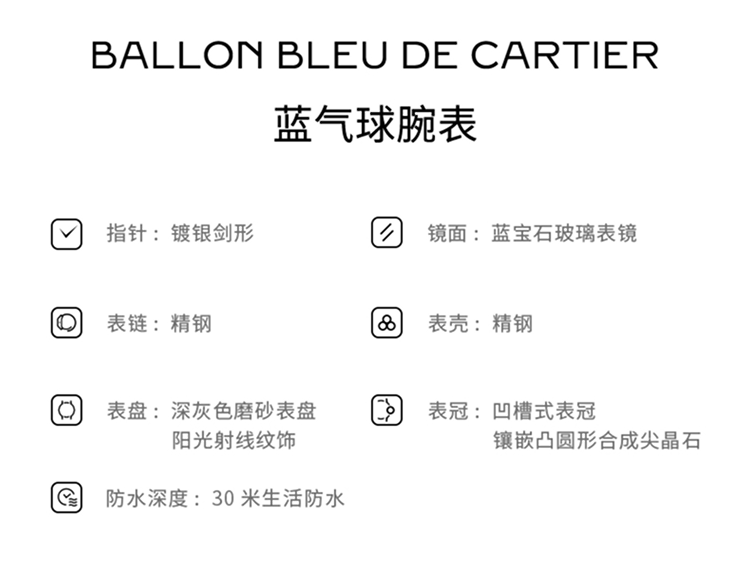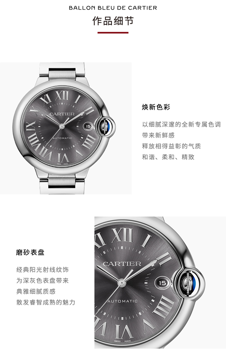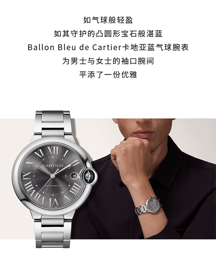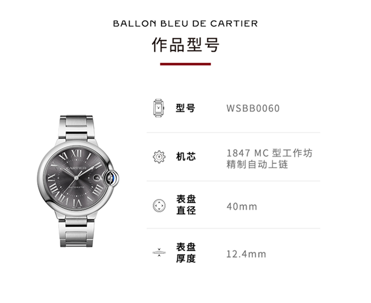 Ballon Bleu de Cartier卡地亚蓝气球腕表,40毫米表款,卡地亚工作坊精制1847 MC型自动上链机械机芯。精钢表壳,凹槽式表冠,镶嵌1颗凸圆形合成尖晶石,深灰色阳光射线纹饰表盘,剑形镀银指针,合成蓝宝石水晶镜面,可替换式精钢表链,3时位置设日期显示窗。厚度:12.4毫米。生活防水深度3巴(约30米)。