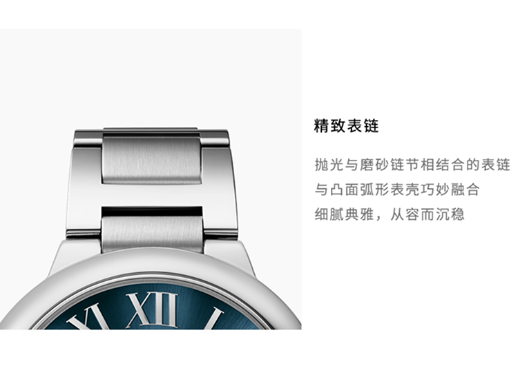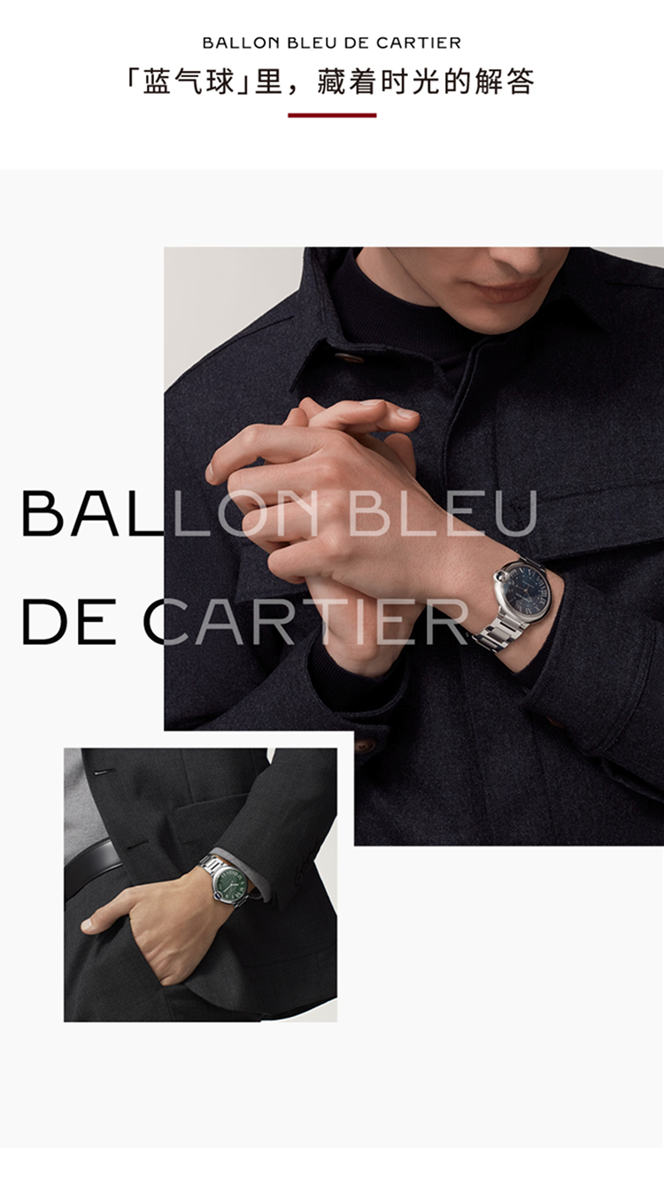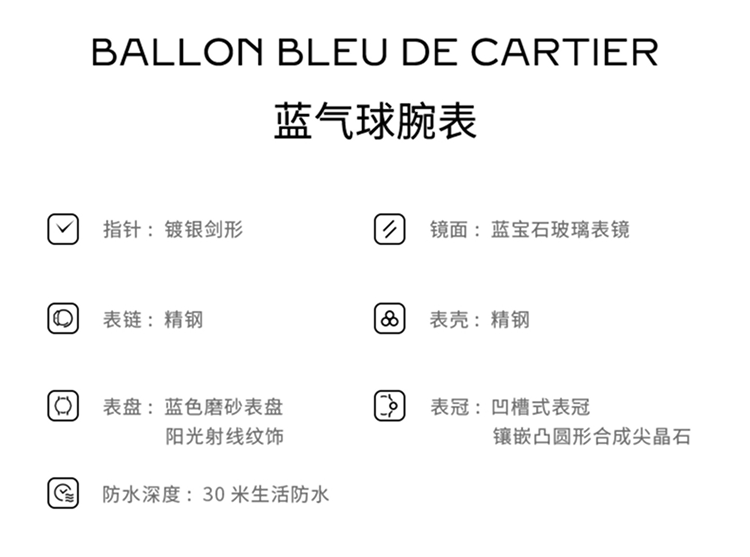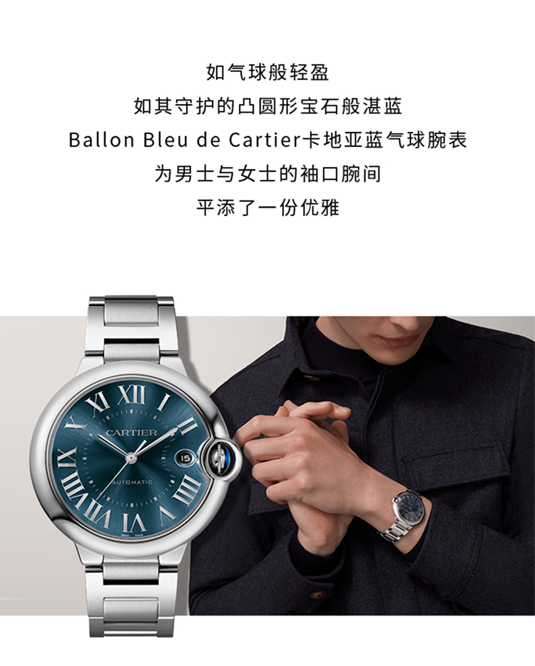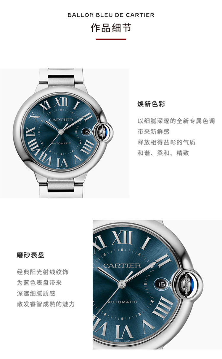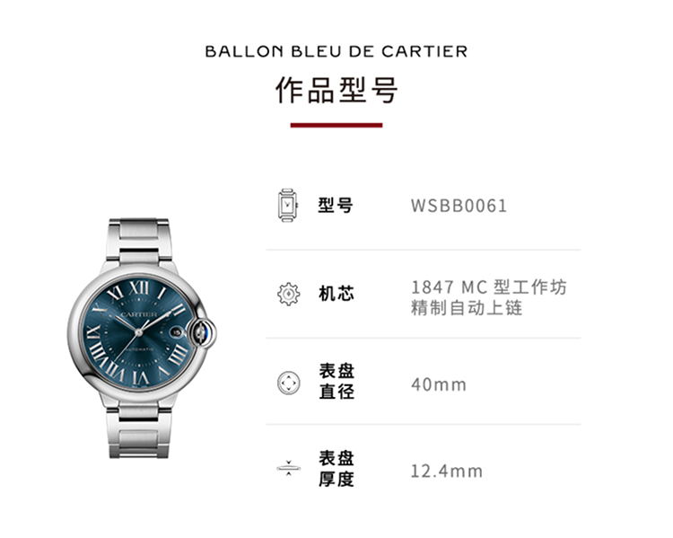 Ballon Bleu de Cartier腕表,40毫米表款,卡地亚1847 MC型工作坊精制自动上链机械机芯。精钢表壳,凹槽式表冠,镶嵌一颗凸圆形合成尖晶石,蓝色磨砂表盘,阳光射线纹饰效果,镀银剑形指针,合成蓝宝石表玻璃,可替换式精钢表链,3时位置设日历显示窗。厚度:12.4毫米。生活防水深度3巴(约30米)。
