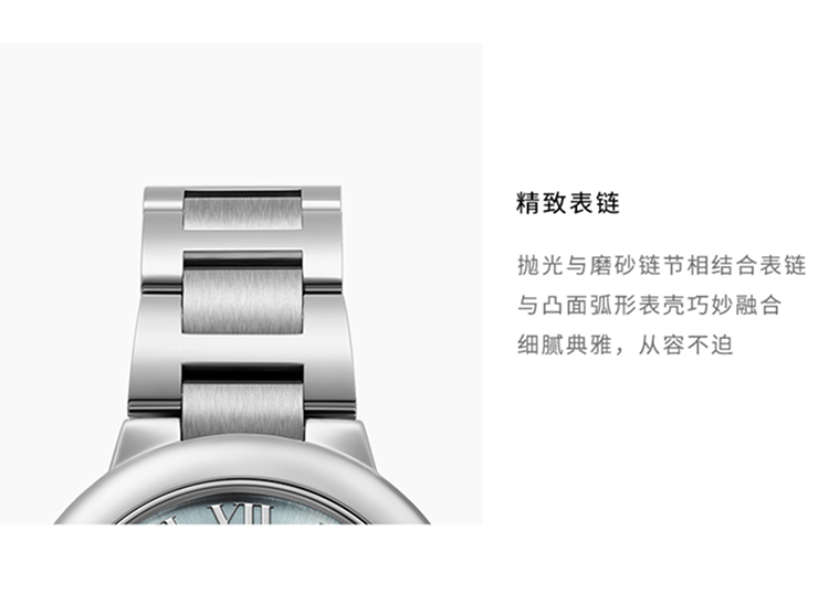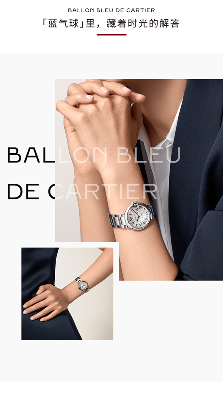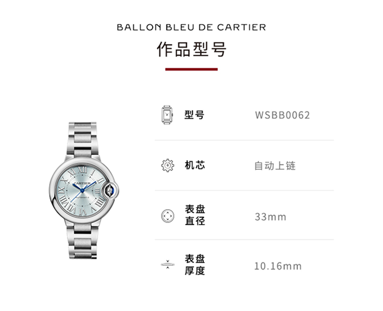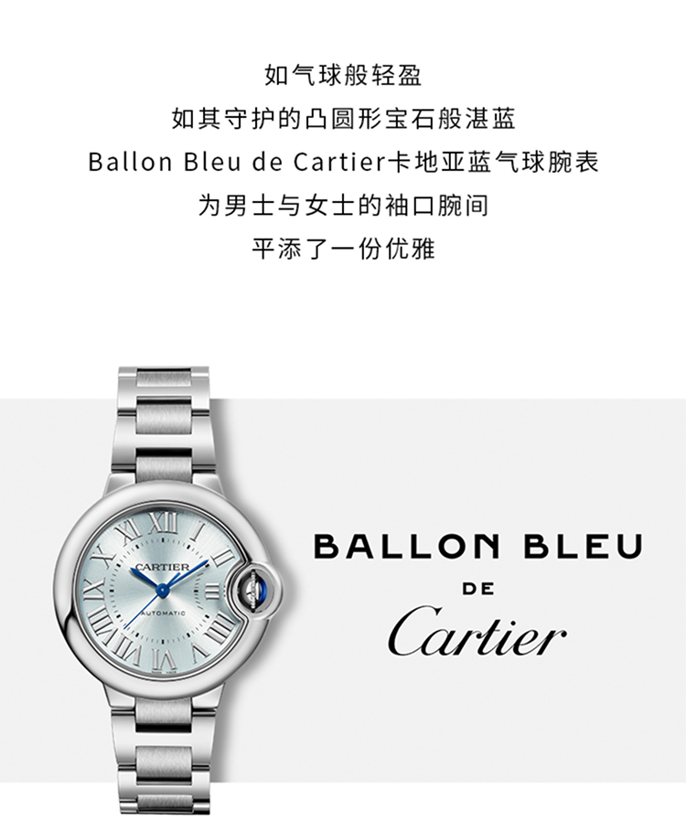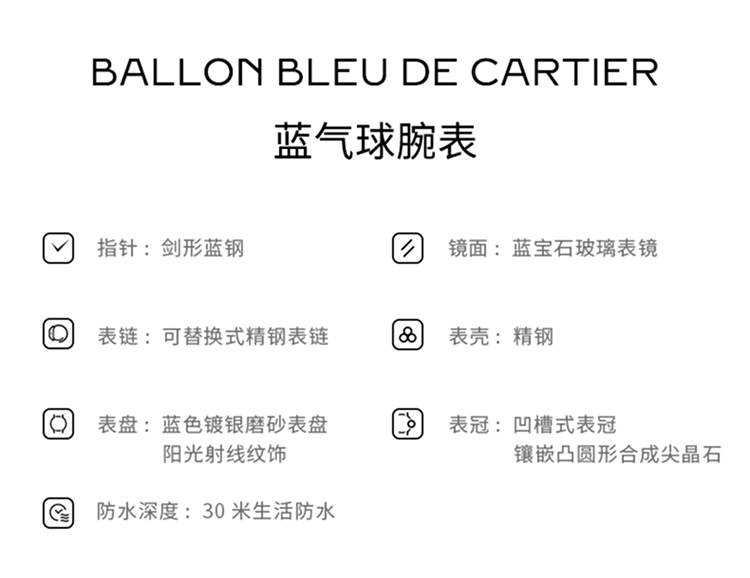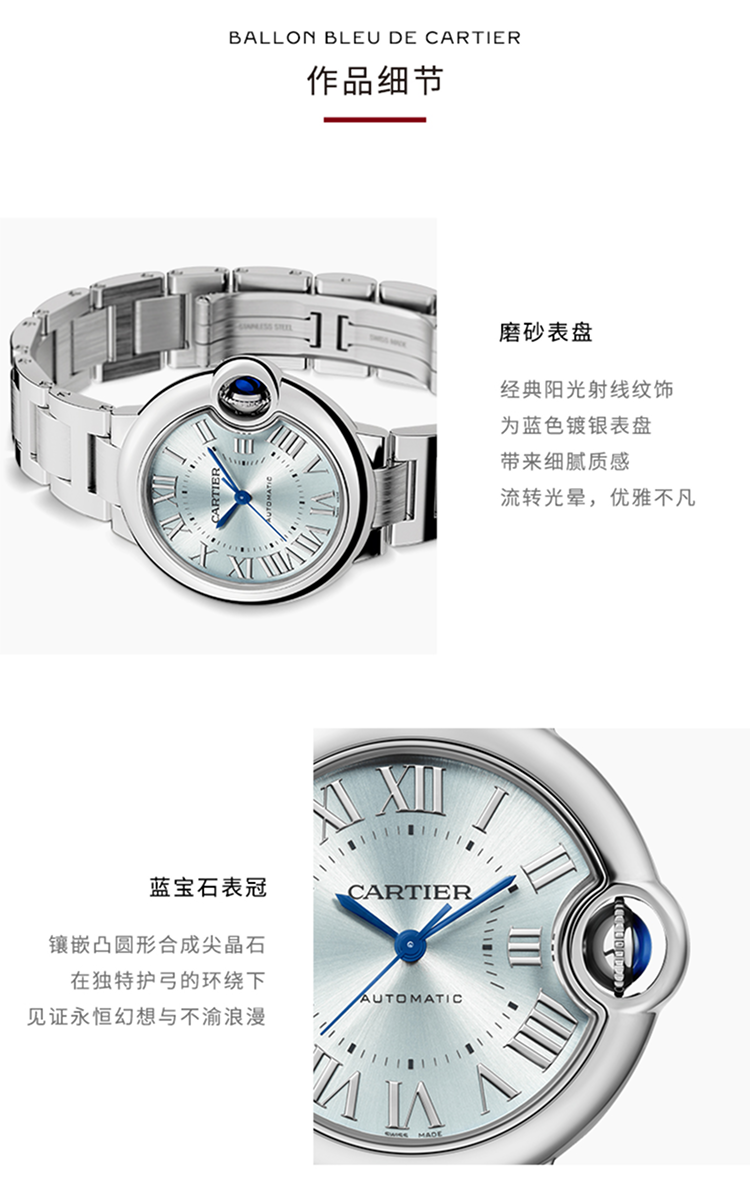 Ballon Bleu de Cartier腕表,33毫米表款,自动上链机械机芯。精钢表壳,凹槽式表冠,镶嵌一颗凸圆型合成尖晶石,蓝色镀银阳光射线纹饰磨砂表盘,剑形蓝钢指针,合成蓝宝石表玻璃,可替换式精钢表链。厚度:10.49 毫米。生活防水深度3巴(约30米/100英尺)。