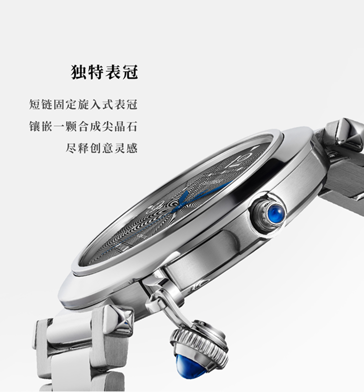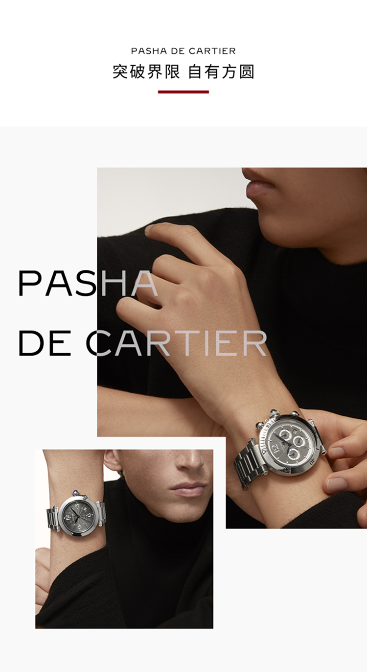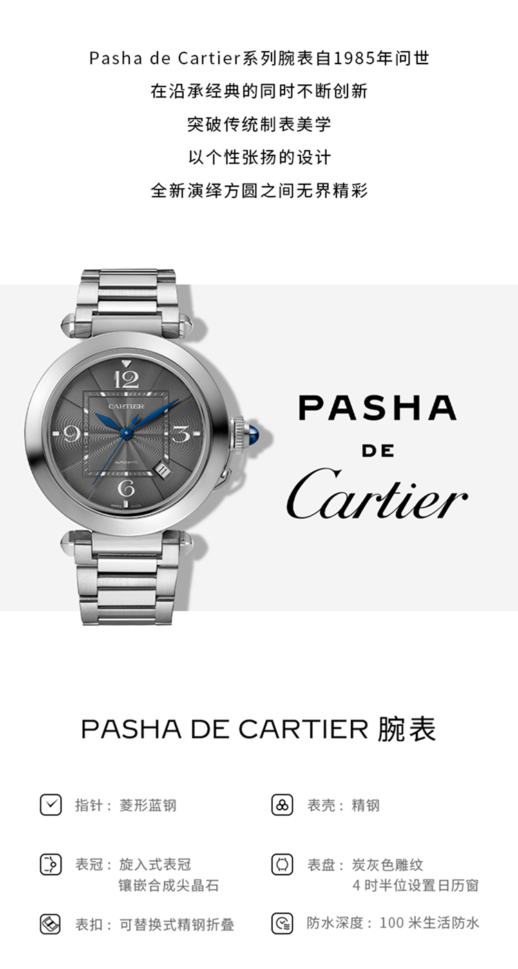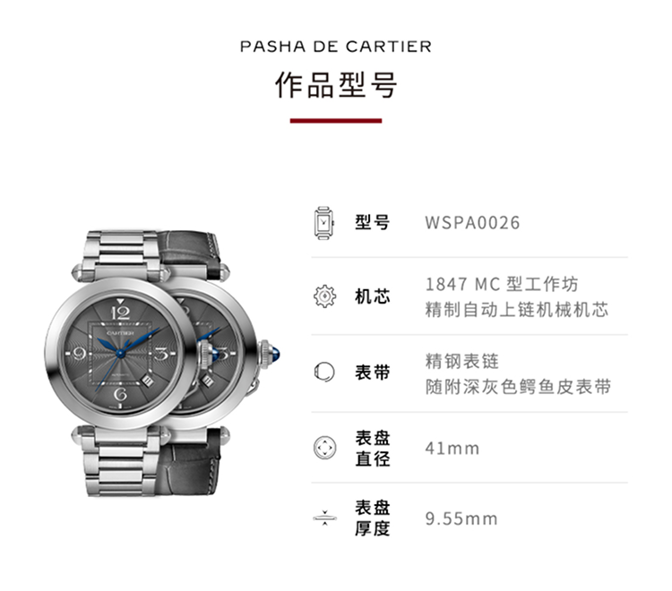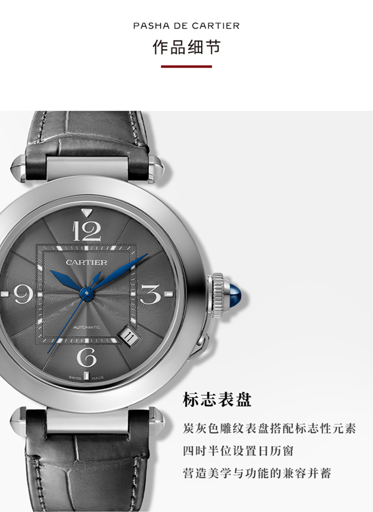 Pasha de Cartier系列腕表,41 毫米,卡地亚1847 MC型工作坊精制自动上链机械机芯。精钢表壳,旋入式表冠,表冠镶嵌合成尖晶石,炭灰色雕纹表盘,菱形蓝钢指针,精钢表链,配备“SmartLink”金属表链调节系统,随附深灰色鳄鱼皮表带,可替换式精钢折叠表扣。表带均配备“QuickSwitch”表带快速替换系统。表壳直径:41 毫米,厚度:9.55 毫米。生活防水深度10巴(约100米)。