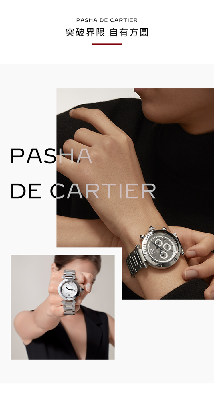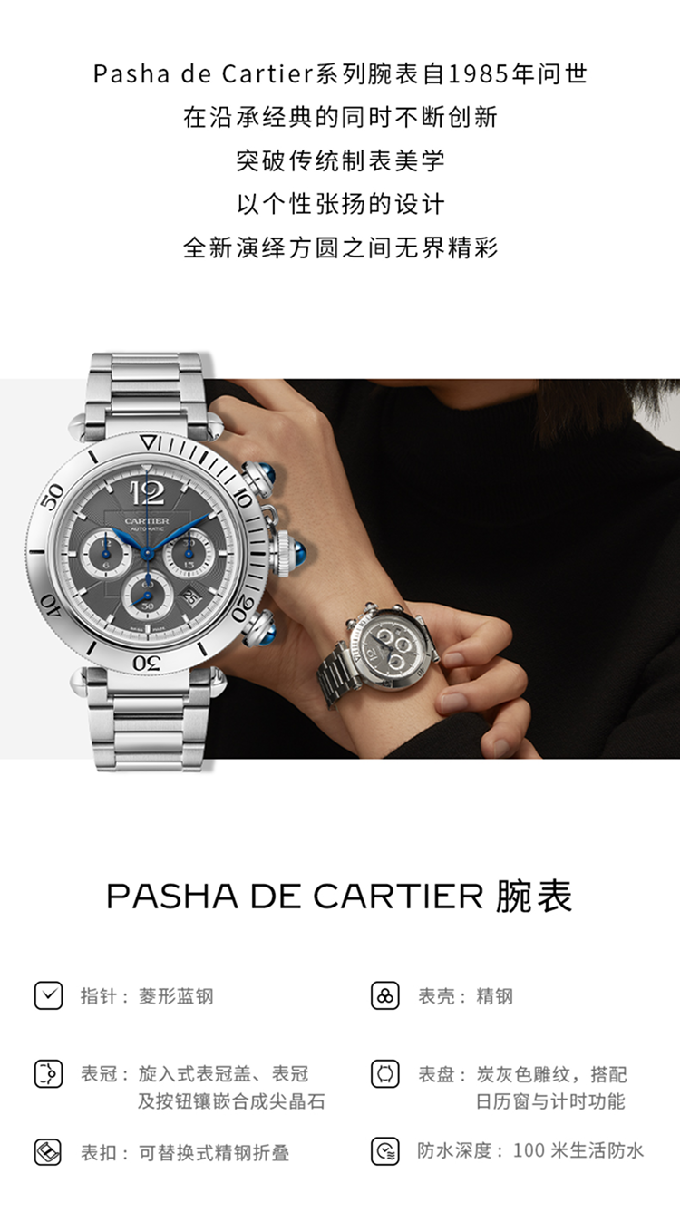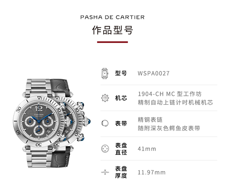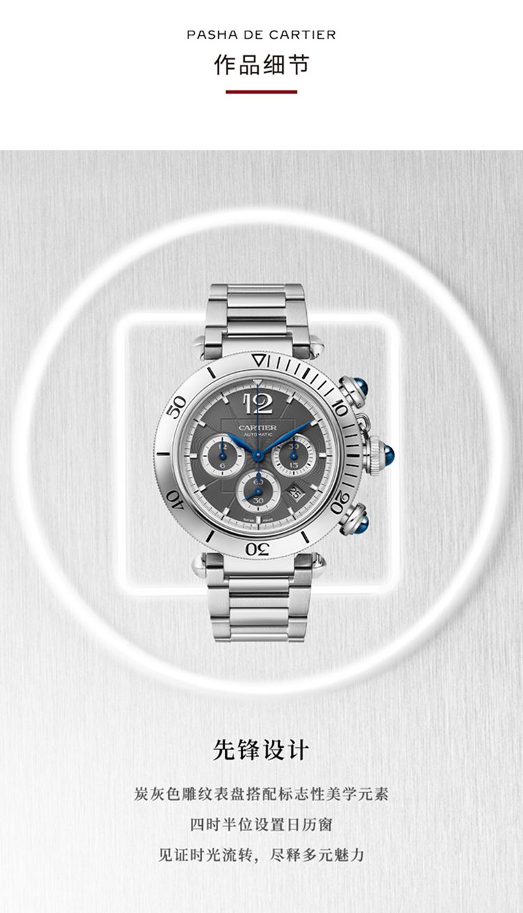 Pasha de Cartier系列腕表,41 毫米,卡地亚1904-CH MC型工作坊精制自动上链计时机械机芯。精钢表壳,旋入式表冠,表冠与按钮镶嵌合成尖晶石,炭灰色雕纹表盘,菱形蓝钢指针,精钢表链,配备“SmartLink”金属表链调节系统,随附深灰色鳄鱼皮表带,可替换式精钢折叠表扣。表带均配备“QuickSwitch”表带快速替换系统。表壳直径:41 毫米,厚度:11.97 毫米。生活防水深度10巴(约100米)。