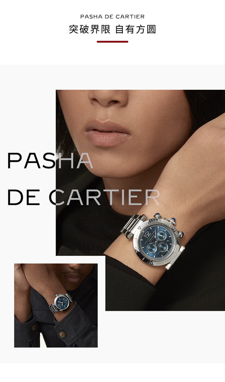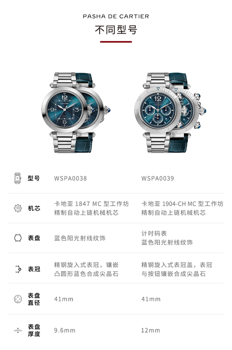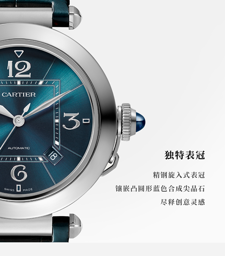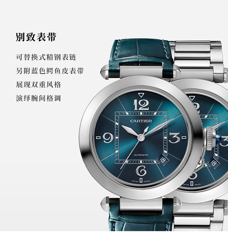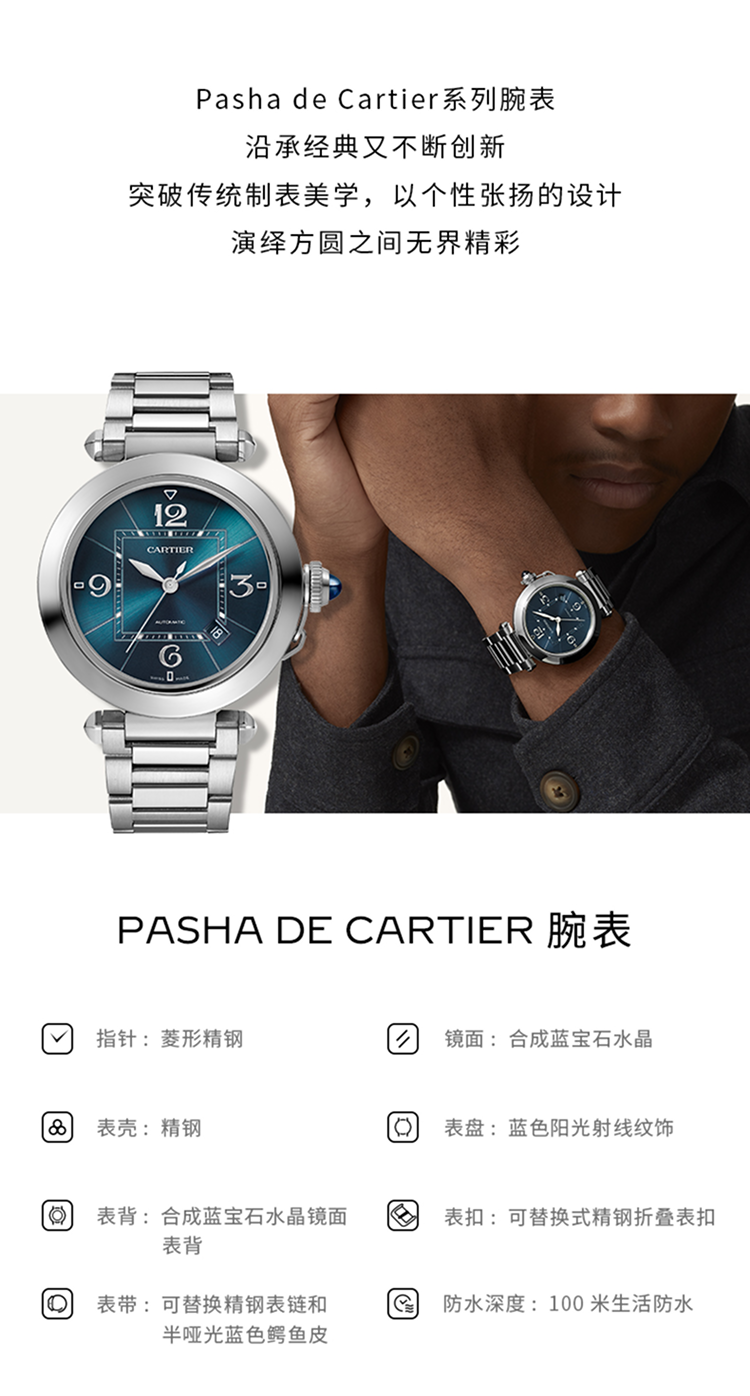 Pasha de Cartier腕表,41 毫米表款,卡地亚1847 MC型工作坊精制自动上链机械机芯。精钢表壳,旋入式表冠盖,表冠镶嵌1颗凸圆形尖晶石,蓝色阳光射线纹饰表盘,菱形精钢指针,精钢表链,配备“SmartLink”金属表链调节系统,蓝色鳄鱼皮表带,可替换式精钢折叠表扣。表带均配备“QuickSwitch”表带快速替换系统。表壳直径:41毫米,厚度:9.55毫米。生活防水深度10巴(约100米)。