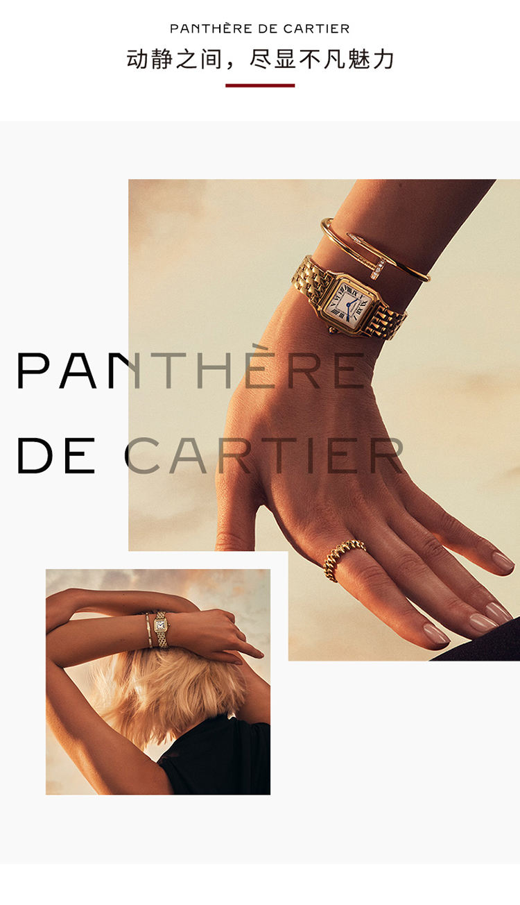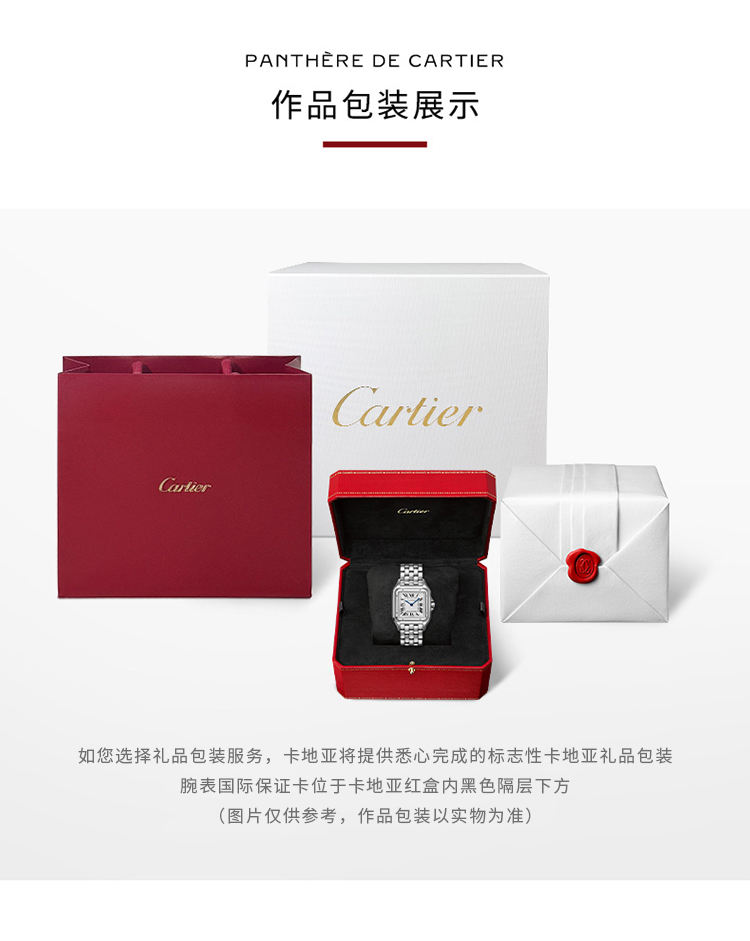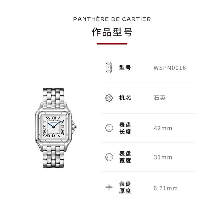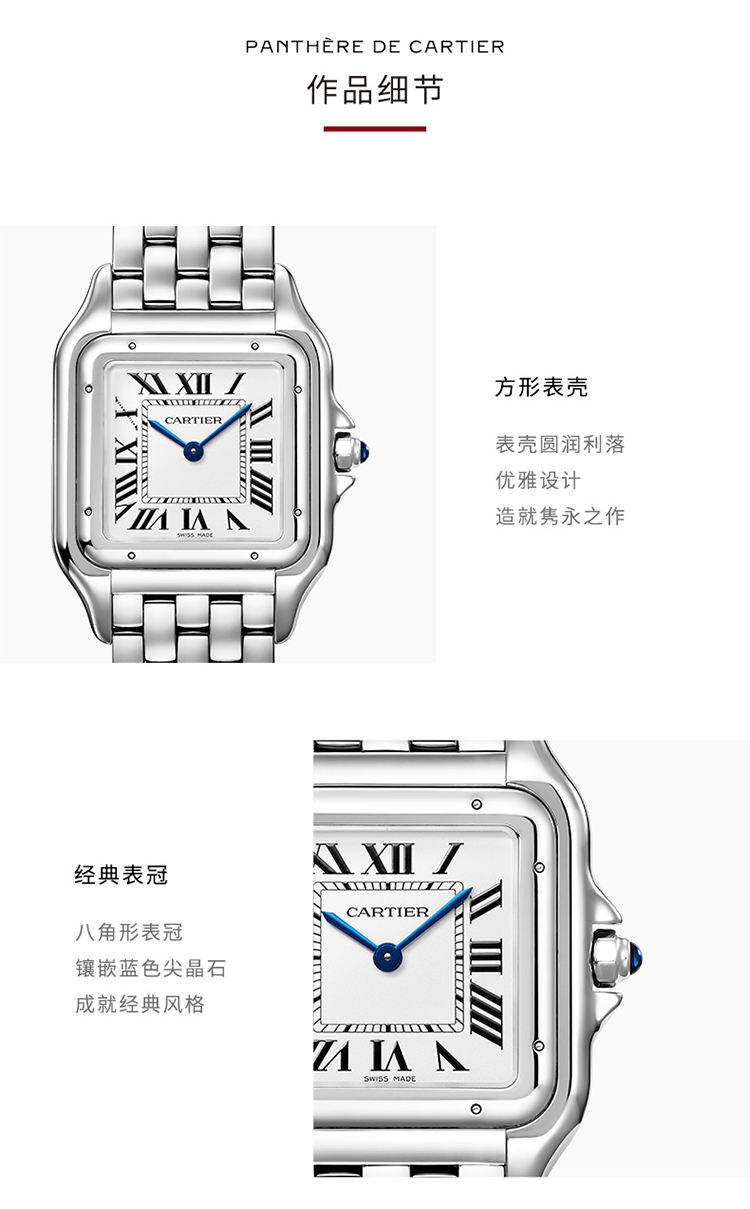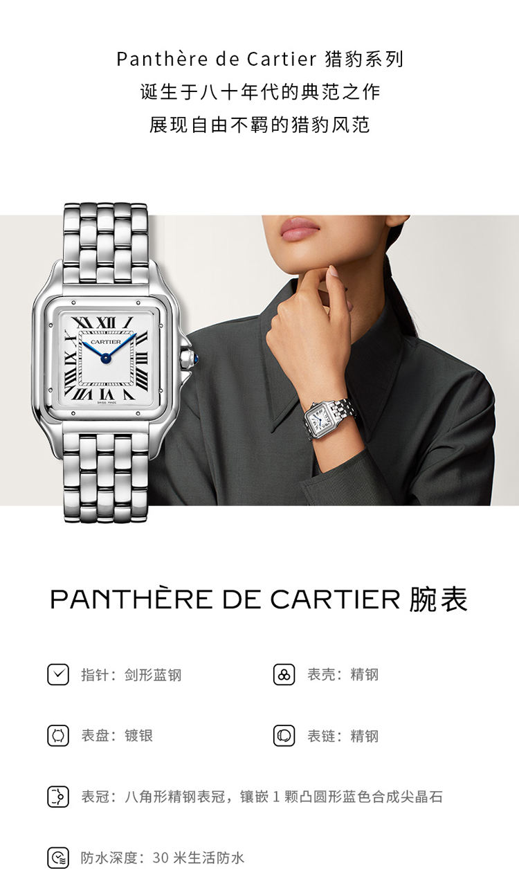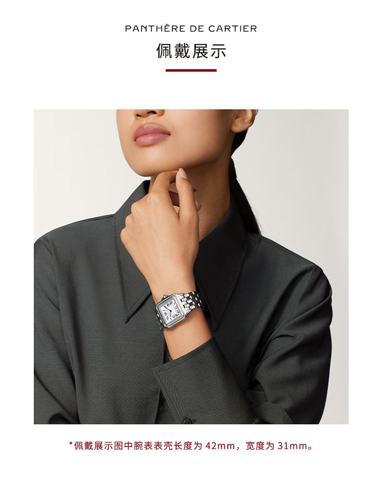 Panthère de Cartier卡地亚猎豹腕表,大号表款,石英机芯。精钢表壳,尺寸:31毫米 x 42毫米,厚度:6.71毫米,精钢表壳,表冠镶嵌一颗蓝色合成尖晶石,镀银表盘,剑形蓝钢指针,精钢表链。 生活防水深度3巴(约30米)。