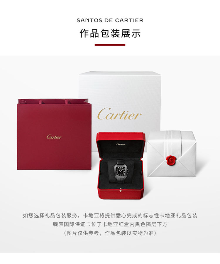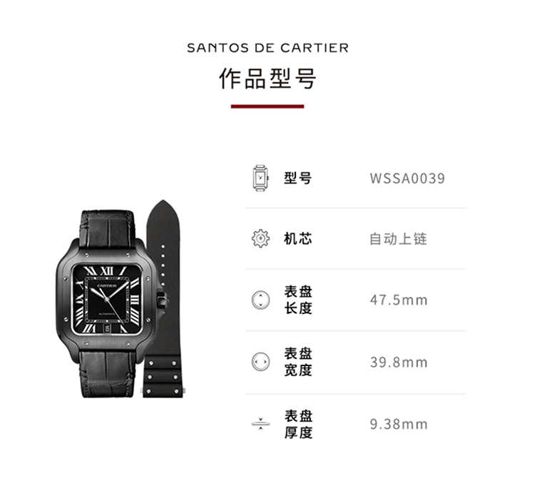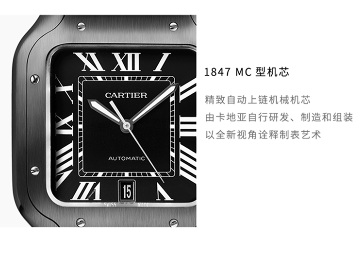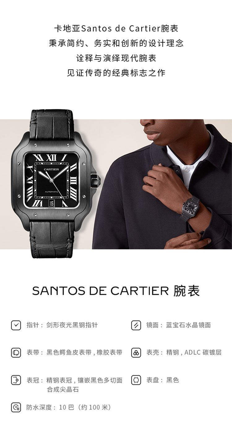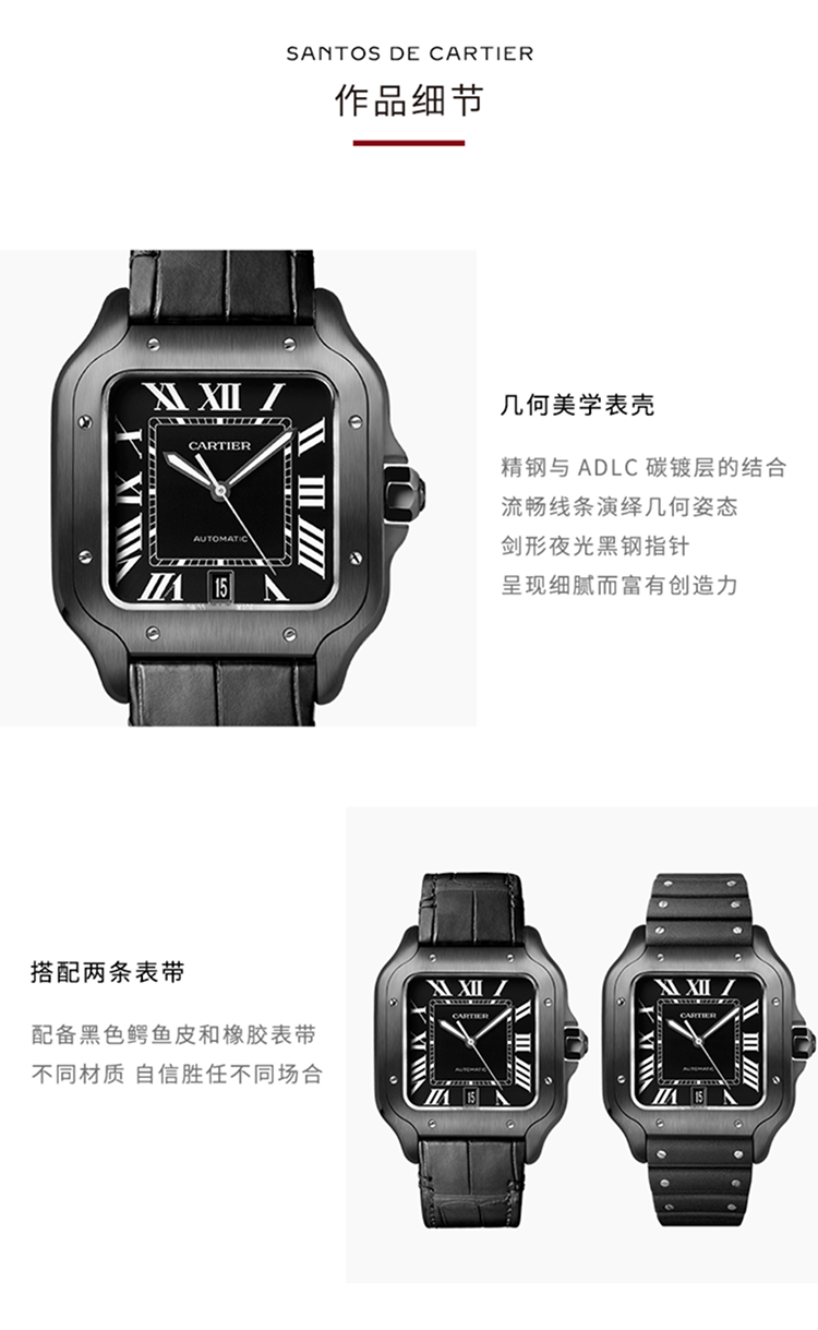 Santos de Cartier腕表,大号表款,卡地亚1847 MC型工作坊精制自动上链机械机芯。精钢和ADLC碳镀层(非晶体类金刚石碳镀层)表圈与表壳,精钢表冠,镶嵌一颗黑色多切面合成尖晶石,黑色表盘,剑形夜光黑钢指针,蓝宝石水晶镜面。橡胶表带,随附黑色鳄鱼皮表带,可替换式精钢折叠表扣。表带均配备QuickSwitch表带快速替换系统。表壳宽度:39.8毫米。厚度:9.38毫米。防水深度10巴(约100米)。