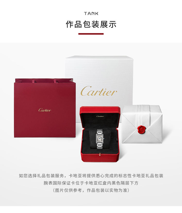 Tank Must腕表,大号表款,高效能石英机芯。精钢表壳,圆珠形表冠,镶嵌一颗凸圆形合成尖晶石,镀银表盘,剑形蓝钢指针,精钢表链。表壳尺寸:33.7毫米 x 25.5毫米,厚度:6.6毫米。生活防水深度3巴(约30米)。