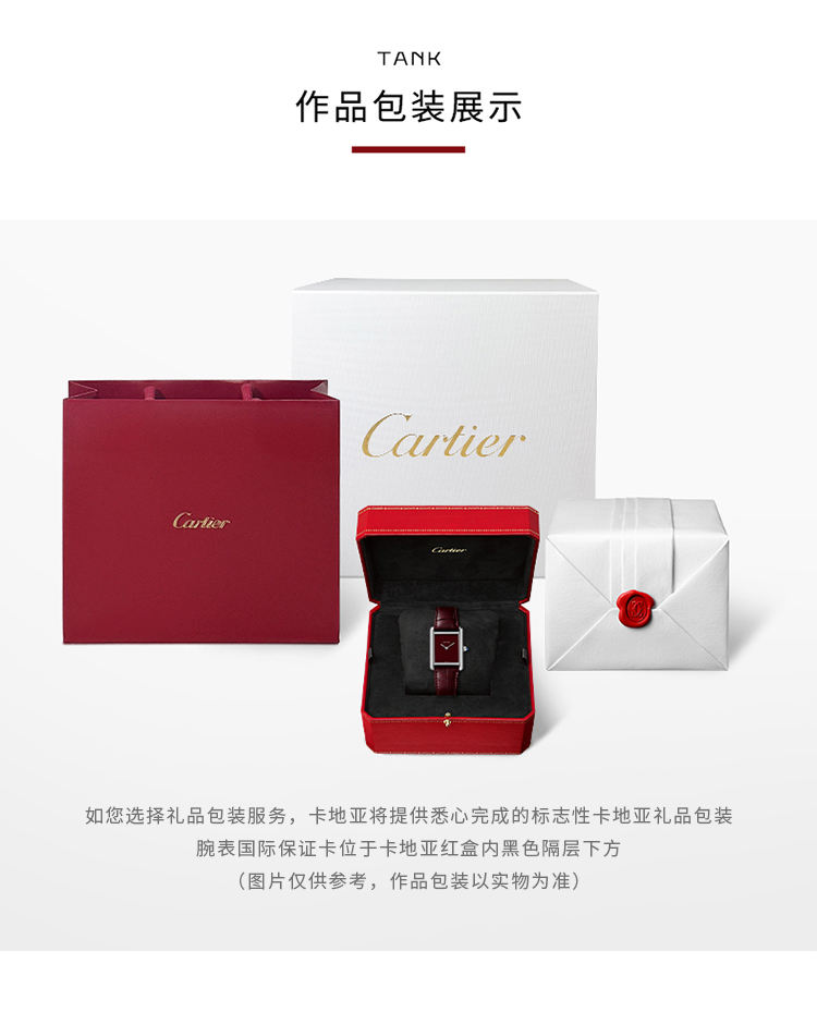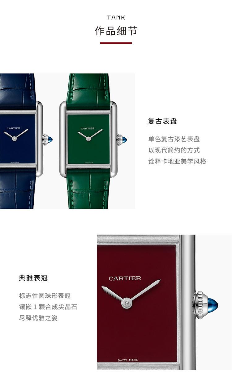 Tank Must腕表,大号表款,高效能石英机芯。精钢表壳,圆珠形表冠,镶嵌一颗凸圆形合成尖晶石,蓝色漆艺表盘,抛光剑形精钢指针,蓝色鳄鱼皮表带,精钢针扣式表扣。表壳尺寸:33.7毫米 x 25.5毫米,厚度:6.6毫米。生活防水深度3巴(约30米)。