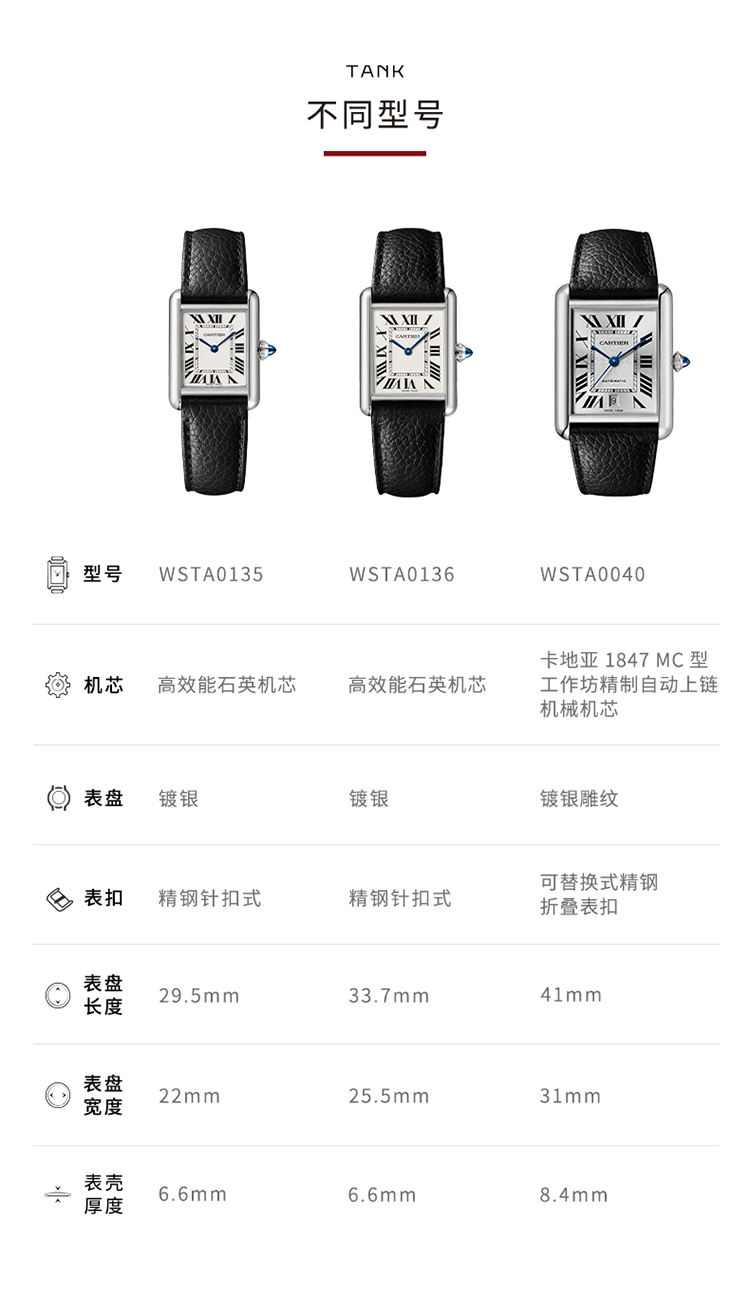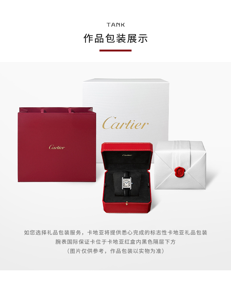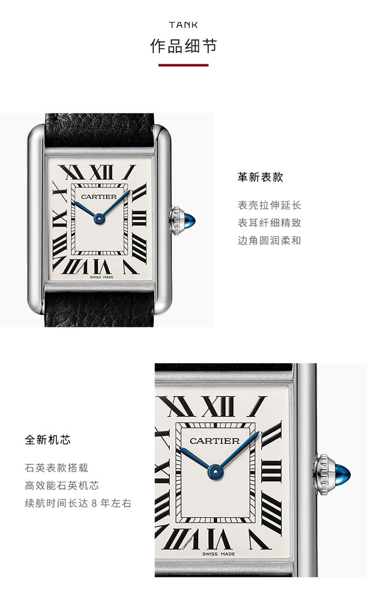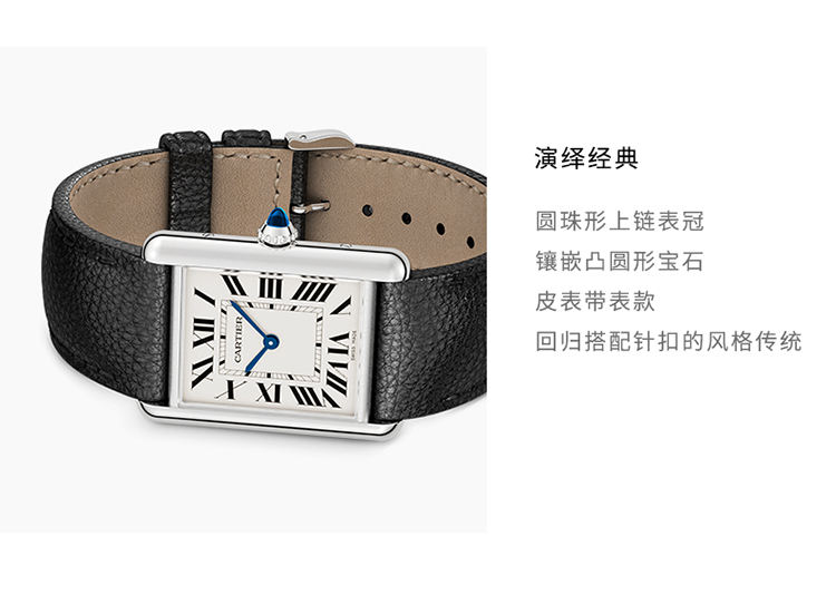 Tank Must腕表,小号表款,高效能石英机芯。精钢表壳,圆珠形表冠,镶嵌1颗凸圆形合成尖晶石,银色表盘,剑形蓝钢指针,黑色粒纹小牛皮表带,精钢针扣式表扣。表壳尺寸:29.5 x 22毫米,厚度:6.6毫米。生活防水深度3巴(约30米)。